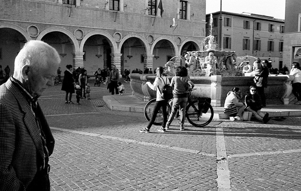 Una foto riflessiva, o da meditazione. Che non va vista e via, ma va, appunto, meditata. Cosa sarebbe la stessa immagine senza il signore che entra da sinistra? Niente direi, una qualunque piazza, con gente qualsiasi che vive. Invece, con lui la posa è in movimento, quasi si vede il passo pur nella staticità della foto. Sono i suoi pensieri che reggono la composizione, e il signore sembra portare su di sé il peso dei problemi di tutti. Una bella meditazione, che ognuno rifletta e ci trovi qualcosa di personale. Avanti, pensate!
