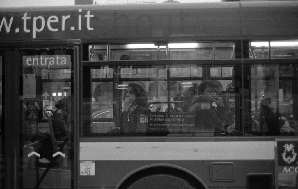 Questa foto potrebbe essere l’emblema della nostra società. Seduti a fianco, ma opposti, uno guarda di qua, uno guarda di là, mai che ci fosse uno sguardo diretto. Nemmeno con il mondo, c’è un vetro in mezzo. E l’autobus può essere visto come la nostra prigione inconsapevole, la nostra chiusura agli altri. E pure se fuori della stazione, sentivo un silenzio assoluto, come un alone attorno ad ogni persona, un bozzolo di insicurezza che fingiamo ci protegga.