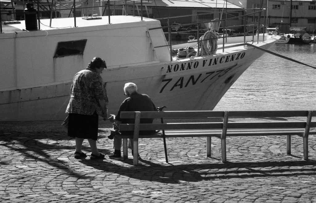 Andavo in bicicletta, e ho visto questa scena. Subito l’ho catturata, mentre “Nonno Vincenzo” allungava la mano, un aiuto per alzarsi. Ho pensato che avesse fatto la sua passeggiata pomeridiana, vicino alla barca che l’aveva, forse, portato in mare ai bei tempi. Un bastone indica la sua difficoltà a camminare, ma ci parla anche della sua volontà di non arrendersi. Il mondo moderno non ripara, getta via, Nonno Vincenzo, invece, resiste e tira avanti, anche se “rotto”. Impariamo da Nonno Vincenzo.