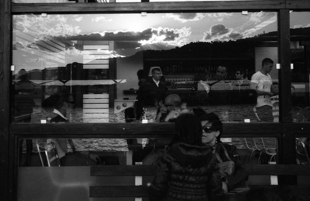 Ho subito pensato a Come in uno specchio di Bergman, chi ha visto il film capirà. Un locale con gli aperitivi al tramonto, potevo fotografare dall’altra parte, ma non sarebbe stata l’immagine corretta. Preferisco la confusione generata dallo specchio, non subito si comprende la scena, bisogna perderci qualche secondo, bisogna essere interessati per decifrarla. Come in uno specchio.