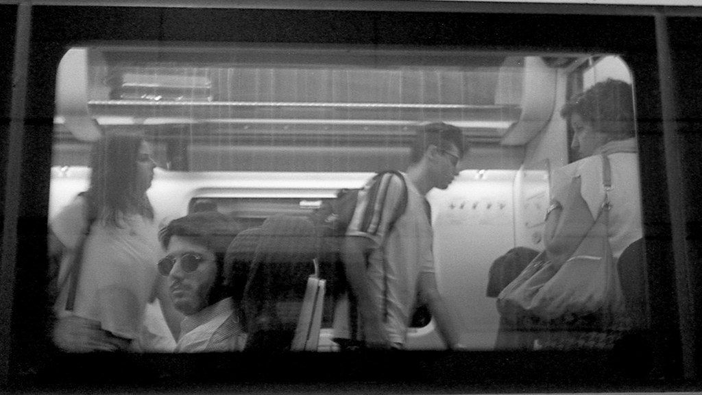 Anche oggi una foto in treno, ma fatta dalla pensilina al convoglio in partenza. Quante volte in questa situazione. In viaggio, giovane, con la borsa, e chissà cosa stanno facendo adesso le persone incontrate per caso una vita fa. Tanti pensieri, come quelli della persona in primo piano, oppure della ragazza, della signora che si guarda indietro. Il tempo è andato avanti per tutti, ma qui è congelato. La forza della fotografia.