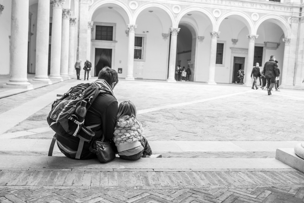 Padre e figlia. Un quadretto classico, che fa bene allo spirito, una speranza per un futuro che tutti vedono nero. Io, invece, quabdo scorgo questi attimi, noto la volontà dell’uomo di superare ogni difficoltò. Vedo ancora donne in gravidanza, bambini molto piccoli, quindi nati da poco, padri con figli in braccio, genitori giovanissimi. Questo mi dà speranza. Non scrivo le solite frasi, le solite cose, ma rifletto e faccio del mio meglio per toglierci da questo impiccio. Anche una foto può stimolare le coscienze, sempre che coloro che io intendo io ne abbiano una.