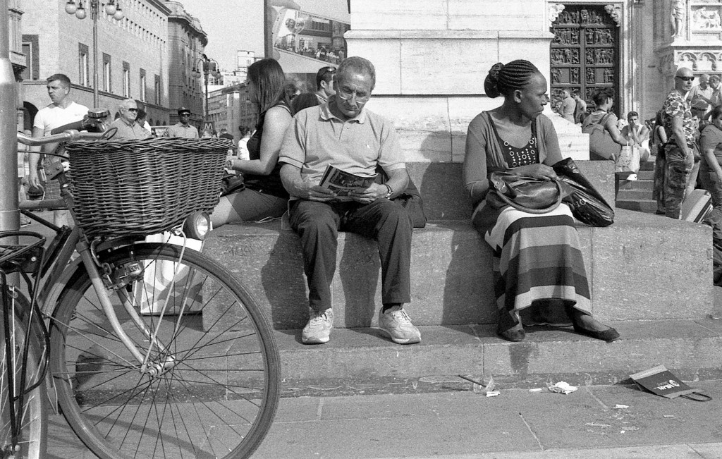 La bicicletta in primo piano perché siamo a Milano, e io associo la città alla bicicletta, al miracolo e a ET. Chi capisce faccia i collegamenti! Comunque, mi piacevano anche i due personaggi, in bianco e nero come la foto. Tutto qui.