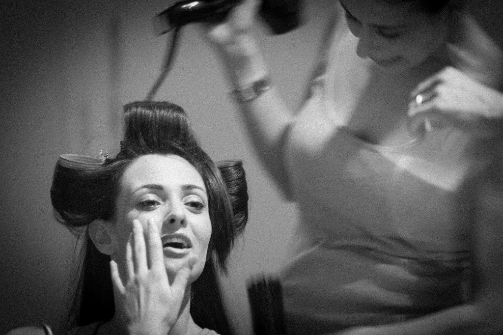 Momento spensierato nella confusione del trucco e parrucco prima della sfilata. Era un caldo infernale, e la modella soffriva sotto il getto caldo, ma qui aveva trovato un attimo per riderci sopra, forse una battuta divertente di qualcuno. E io ho colto questo attimo di sollazzo generale, anche la parrucchiera rideva. Ed in effetti, ridevo anche io!