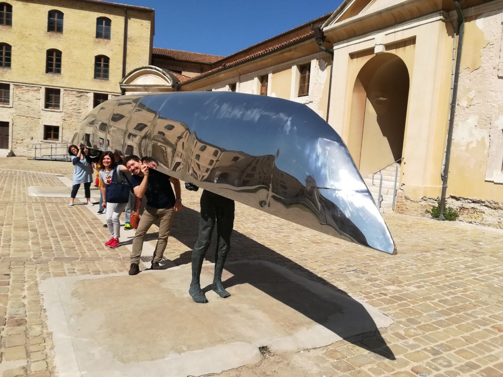 Tutti sotto la barca capovolta…che chiaramente è una scultura! Mi piaceva il riflesso dei palazzi sullo scafo, e l’allegria della combriccola che si era infilata a tradimento sotto la barchetta…a volte ci vuole una sana ironia…