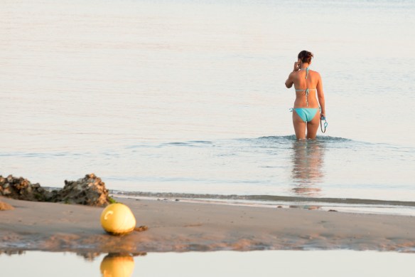 Signora a bagno di mattina presto. Una boa osserva.