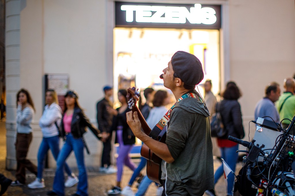 Cantastorie in mezzo alla strada. Non si fermava nessuno, io sì, e l’ho fotografato, nell’indifferenza della gente.