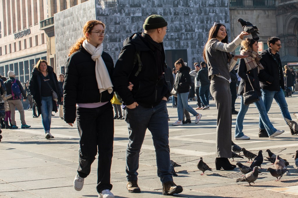 Giocare con i piccioni ina una piazza assolata. Bellissimo.